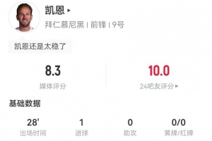 體育資訊1月29日訊 拜仁在本輪歐冠2-1力克埃因霍溫,凱恩本場數(shù)據(jù)如下: