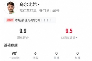 體育資訊1月29日訊 拜仁在本輪歐冠2-1力克埃因霍溫,小將烏爾比希本場數據如下: