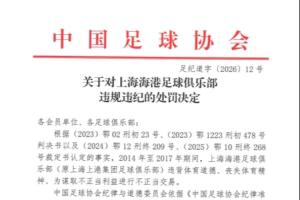 體育資訊01月29日訊 中國足協公布足球行業“假賭黑”處罰決定,上海海港俱樂部被扣5分并罰款40萬元。