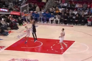 GIF-??怂归L傳越過兩人,文班亞馬接球轉身雙手暴扣