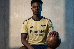 阿森納2026-27賽季第二客場球衣以淺黃色為主色調,海軍藍為輔助色,用于標識、鑲邊及圖案細節。