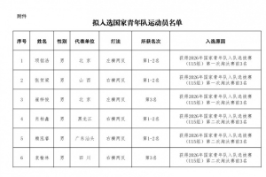 根據中國乒乓球協會關于舉辦2026年國家青年隊入隊選拔賽(U15組)的通知及《2026年國家青年隊入隊選拔賽(U15組)競賽規程》要求,21名運動員擬入選國家青年隊?,F對運動員名單進行公示,公示期為2026年1月29日至2026年2月3日(名單附后)。