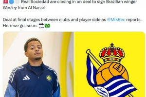 體育資訊1月29日訊 據知名記者羅馬諾報道,皇家社會接近簽下巴西邊鋒韋斯利。