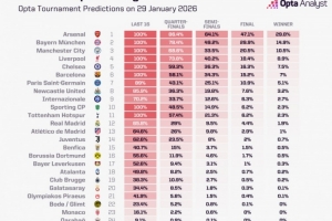 體育資訊1月30日訊 歐冠聯(lián)賽階段已經(jīng)結(jié)束了全部爭奪,除了已經(jīng)被淘汰的8支球隊外,OPTA對剩余球隊的奪冠概率進(jìn)行了預(yù)測,阿森納以29.8%居首,拜仁以14.9%位居次席。