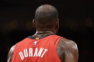 第三節,火箭球星杜蘭特火力全開,單節9中6獨得16分,三節打完21投11中,三分7中2、罰球4中4砍下28分4籃板3助攻,正負值+9。