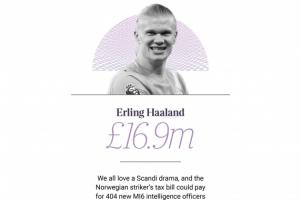 據榜單數據顯示,曼城前鋒哈蘭德周薪約50萬英鎊,年度獎金高達1000萬英鎊,以每年繳納1690萬英鎊的稅款位列榜單第72位。哈蘭德也是這份榜單中最年輕的人(25歲)。