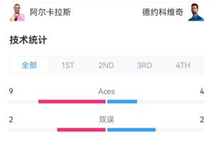 賽后雙方數據統計,德約的非受迫性失誤多大44次,而對手阿爾卡拉斯為27次,制勝分德約和阿爾卡拉斯32-35不相上下,Aces球阿卡9次,德約4次。