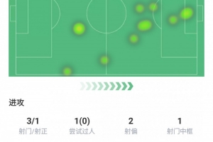 射門3次,射正1次,過人1次沒成功,射偏2次,中柱1次,丟失球權2次,預期進球0.6球
