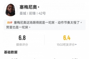 體育資訊2月2日訊 英超第24輪焦點戰,曼城客場2-2熱刺。塞梅尼奧首發出戰,打進1粒進球,6次過人0成功,18次丟失球權全場最多,評分6.8。