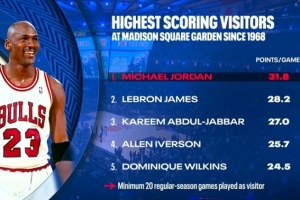 湖人客場挑戰(zhàn)尼克斯,轉播方給出麥迪遜客場球員場均得分榜(至少打20場):