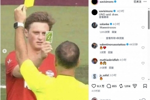 哈維·西蒙斯社媒曬出自己被出示黃牌的照片,以及球員向裁判出示UNO卡牌的梗圖,配文:“UNO說——抽牌(雙關平局)。”