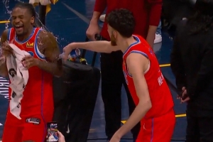 賽后,切特·霍姆格倫直接用礦泉水潑華萊士以表慶祝。