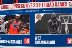 此外,值得注意的是,亞歷山大目前連續(xù)58場(chǎng)客場(chǎng)得分20+,已經(jīng)追平了張伯倫保持的NBA歷史紀(jì)錄!