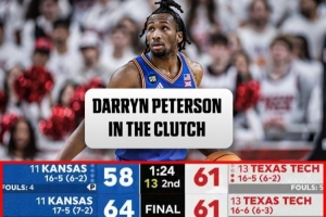 比賽最后時刻,堪薩斯大學打出一波17-4的攻擊波完成大逆轉(zhuǎn),彼得森最后投中了兩記高難度三分,包括準絕殺的三分。