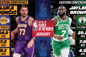 在1月,東契奇場均34.0分7.2籃板9.1助攻,湖人取得了9勝7負的戰績;杰倫·布朗場均29.2分7.9籃板4.6助攻,凱爾特人取得了10勝6負的戰績。