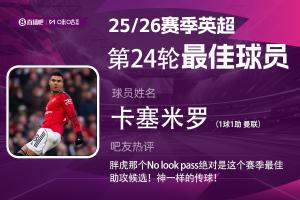 2025-2026賽季英超火熱進(jìn)行中,體育資訊和咪咕體育聯(lián)合發(fā)起每輪英超最佳球員評(píng)選活動(dòng)!第24輪評(píng)選結(jié)果已經(jīng)出爐,曼聯(lián)中場(chǎng)卡塞米羅當(dāng)選!這也是舍什科、B費(fèi)、庫(kù)尼亞之后,曼聯(lián)球員連續(xù)4輪蟬聯(lián)本獎(jiǎng)項(xiàng)。