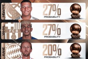 體育資訊02月04日訊 相關(guān)機(jī)構(gòu)近期更新了2026年金球獎(jiǎng)的獲獎(jiǎng)概率預(yù)測(cè),目前姆巴佩與亞馬爾并列領(lǐng)跑,兩人獲獎(jiǎng)概率均為27%,凱恩和哈蘭德則緊隨其后。