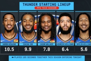本場比賽雷霆的首發是阿隆·維金斯、以賽亞·喬、卡森·華萊斯、肯里奇·威廉姆斯、杰林·威廉姆斯,其中僅有維金斯場均得分上雙,本賽季此前,這套首發僅合同打了105秒。
