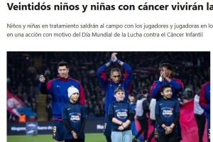 22名正在接受癌癥治療的兒童受邀來到俱樂部,他們將在2月7日男足對陣馬洛卡的比賽,以及2月15日女足對陣埃瓦爾的比賽中,作為球童與巴塞羅那的球員們手牽手步入球場。