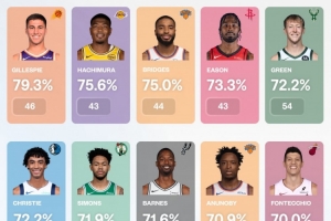 注:至少出手40次接球投籃;有效命中率=(命中數+0.5×三分命中數)/出手數