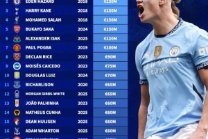 體育資訊11月12日訊 德國轉(zhuǎn)會市場盤點(diǎn)了英超各隊(duì)歷史身價(jià)最高球員,哈蘭德以2億歐居首,阿扎爾、凱恩、薩拉赫和薩卡均為1.5億歐。