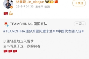 中國短道速滑運動員林孝埈在社媒轉(zhuǎn)發(fā)了中國代表團(tuán)現(xiàn)身開幕式的照片,并配上了“??????”的emoji。
