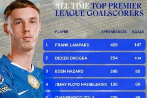 體育資訊2月7日訊 在本輪英超切爾西對陣狼隊的比賽中,帕爾默點射雙響,為球隊在英超打進43球,超越特里升至隊史英超射手榜第8,以下為具體榜單: