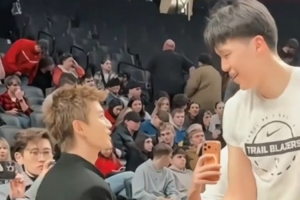 體育資訊2月8日訊 今日上午開拓者主場背靠背再戰灰熊,賽前演員任嘉倫來到場邊給楊瀚森加油,與其握手聊天。