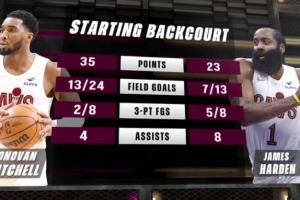 米切爾本場24中13,三分8中2砍下35分4助攻;哈登13中7,三分8中5砍下23分8助攻。