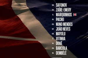 39-薩福諾夫、33-扎伊爾·埃梅里、5-馬爾基尼奧斯、51-帕喬、25-努諾·門德斯、87-若昂·內(nèi)維斯、24-馬尤盧、17-維蒂尼亞、14-杜埃、29-巴爾科拉、10-登貝萊