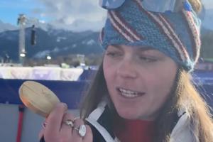 體育資訊02月09日訊 美國選手布麗茲·約翰遜奪得米蘭冬奧會高山滑雪女子滑降金牌,賽后布麗茲·約翰遜的金牌和綬帶的連接處損壞。