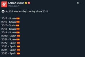 西甲官推隨后轉發了這條動態,并表示:“西班牙包攬了2015年至今的所有西甲冠軍?!?/p>