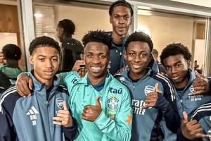 維尼修斯隨巴西隊在阿森納基地訓練,備戰這場友誼賽,他與阿森納的青訓球員合影。
