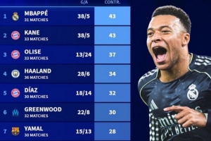 1. 姆巴佩(皇馬),31場,38球+5助攻=43球