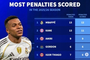 體育資訊2月10日訊 《轉(zhuǎn)會(huì)市場(chǎng)》統(tǒng)計(jì)了本賽季五大聯(lián)賽球員點(diǎn)球進(jìn)球情況,姆巴佩力壓凱恩居首。