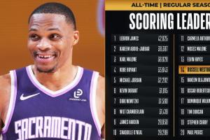 目前,國王球星威少已經得到17分,NBA生涯常規賽總得分突破27000分大關,成為歷史上第14位至少27000分的球員。