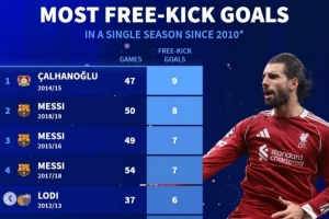 體育資訊2月10日訊 利物浦在本輪英超1-2被曼城逆轉,索博斯洛伊打進直接任意球,本賽季已4進任意球。數據統計顯示,他也能在2010年后的五大聯賽球員單賽季各項賽事任意球進球榜位列第22位。