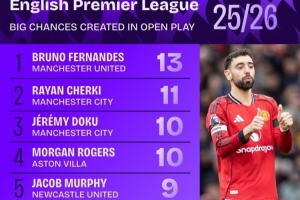 體育資訊2月10日訊 squawka統(tǒng)計(jì)了本賽季英超球員在運(yùn)動戰(zhàn)創(chuàng)造重大機(jī)會情況,曼聯(lián)隊(duì)長B費(fèi)依然領(lǐng)跑。