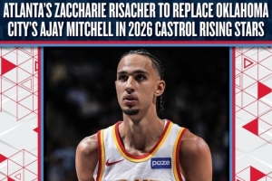 體育資訊2月11日訊 NBA官方宣布,24年狀元秀老鷹前鋒里薩謝將頂替雷霆后衛阿杰伊·米切爾,加入特麥迪執教的Team T-Mac,出戰2026年全明星新秀挑戰賽。
