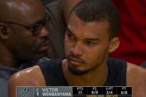 第一節(jié),馬刺球星文班亞馬火力全開(kāi),打了8分鐘9投8中,三分4中3、罰球8中6砍下25分3籃板1搶斷1蓋帽,正負(fù)值+13。