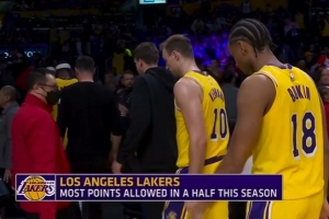 上半場,殘陣湖人讓對手轟下84分,創下球隊本賽季半場失分紀錄。