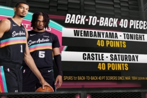 上一場戰(zhàn)勝獨行俠,卡斯?fàn)柨诚?0分12籃板12助攻。這是馬刺自1984年的格文和邁克·米切爾以來,首次出現(xiàn)連場不同球員砍下40+的情況。