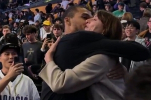 賽后,文班亞馬和場邊觀戰的母親擁抱。