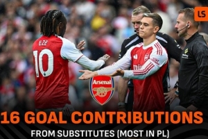 本賽季,阿森納替補球員在英超參與了16個進球,在聯賽排名第一,而曼城的替補球員只參與2個進球,聯賽最少。