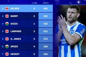 體育資訊2月12日訊 布萊頓在本輪英超對陣阿斯頓維拉,40歲米爾納替補出戰。數據統計顯示,他也追平巴里并列英超歷史出場王。