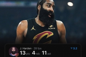 據統計,加盟騎士后的前三場比賽,哈登已累計得到58分16籃板26助攻,并列成為隊史最快達成50+分和25+助攻的球員。