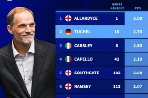 體育資訊2月12日訊 圖赫爾正式與英格蘭隊續約至2028年,德轉也盤點了英格蘭隊史場均積分最高主帥榜單,具體如下: