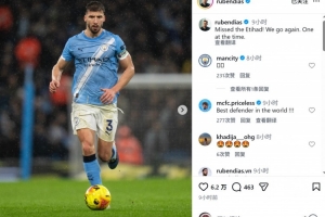 魯本·迪亞斯傷愈后首次在主場出戰(zhàn),他首發(fā)踢滿全場,賽后魯本·迪亞斯社媒寫道:“想念伊蒂哈德球場,我們再次出發(fā),一場一場來。”