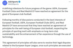 體育資訊2月13日訊 歐超公司A22社媒發表聲明,確認歐足聯、皇馬、歐洲俱樂部協會達成原則協議,正式終結持續5年的歐超聯賽項目及相關法律糾紛