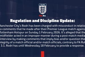 體育資訊2月13日訊 英足總發布公告,羅德里被指控在對陣熱刺賽后采訪中被指控不當言論,需要在2月18日前做出回應。